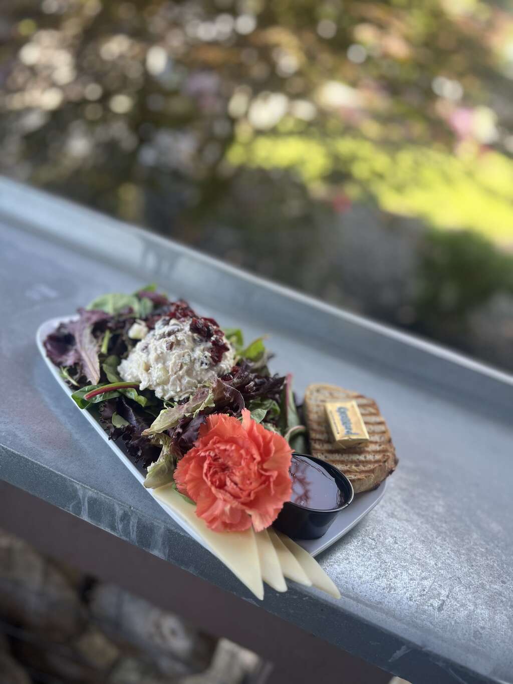 Our homemade pecan chicken salad with dried cranberries, aged white cheddar on mixed greens with fat free raspberry vinaigrette. Served with rosemary potato bread.